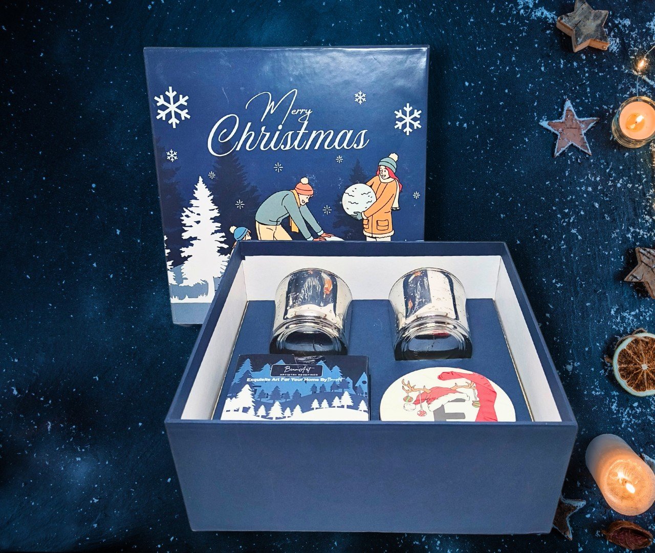 - Two 150g Christmas-Scented Candles: Infused with premium soy wax and essential oils, our candles come in festive fragrances that fill your home with a cozy holiday ambiance.
