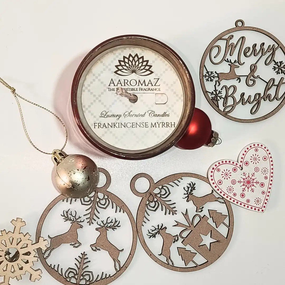 Celebrate the season with the classic aroma of Frankincense Myrrh Scented Candle. This soy wax candle exudes timeless sophistication, perfect for creating a serene and festive ambiance.